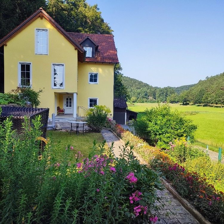 Ein weitläufiger, bepflanzter Garten lädt zum Entspannen, Spielen und Verweilen ein. Der Bachmühlbach entspringt 100 Meter entfernt in der benachbarten Wiese. Das Naturschutzgebiet grenzt direkt an unser Grundstück.